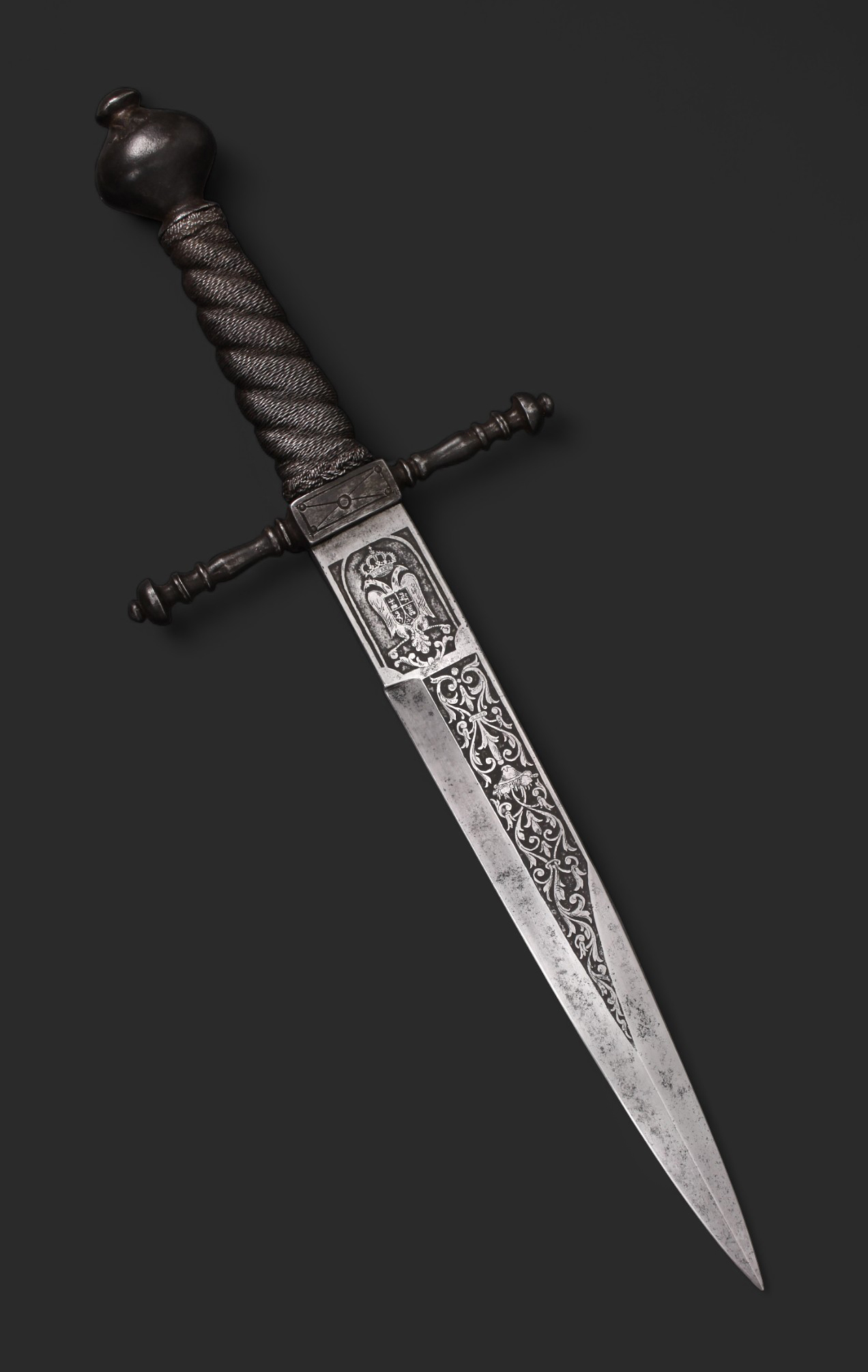 Guarnición de hierro pavonada, formada por una cruz de gavilanes rectos con puente protector central y pomo rematado en perilla. El puño de madera, de talla salomónica, está alambrado con torzal de hierro y presenta en ambos extremos virolas tipo “cabeza de turco”. La hoja de acero, finamente grabada con fondos pavonados en negro, muestra en un lateral de la bigotera el escudo simplificado de España de la Casa de Austria y, en el opuesto, la inscripción “FÁBRICA DE TOLEDO” (el año ha sido eliminado). Muy buena conservación. Leves picados en la hoja. Longitud total 39 cm.