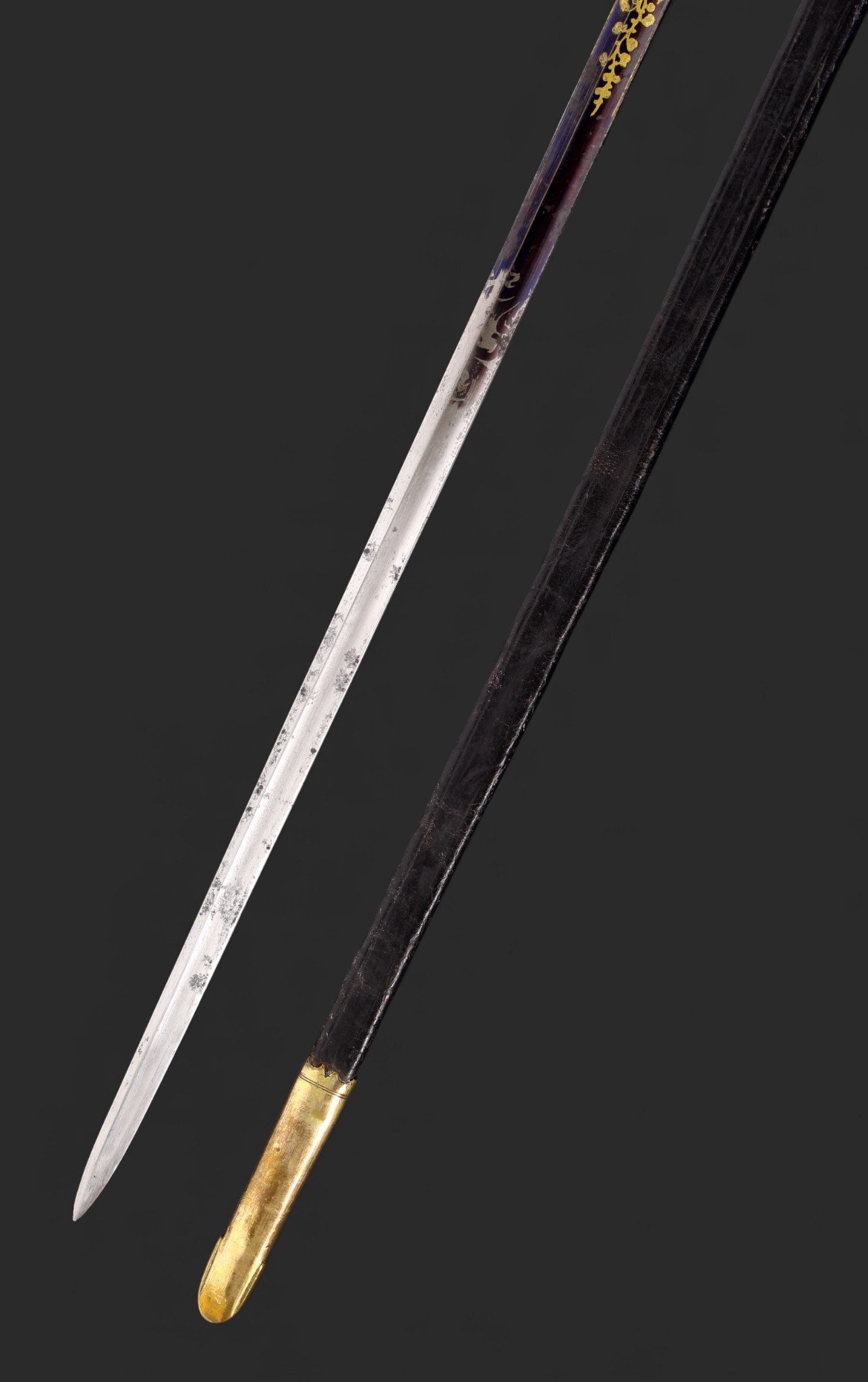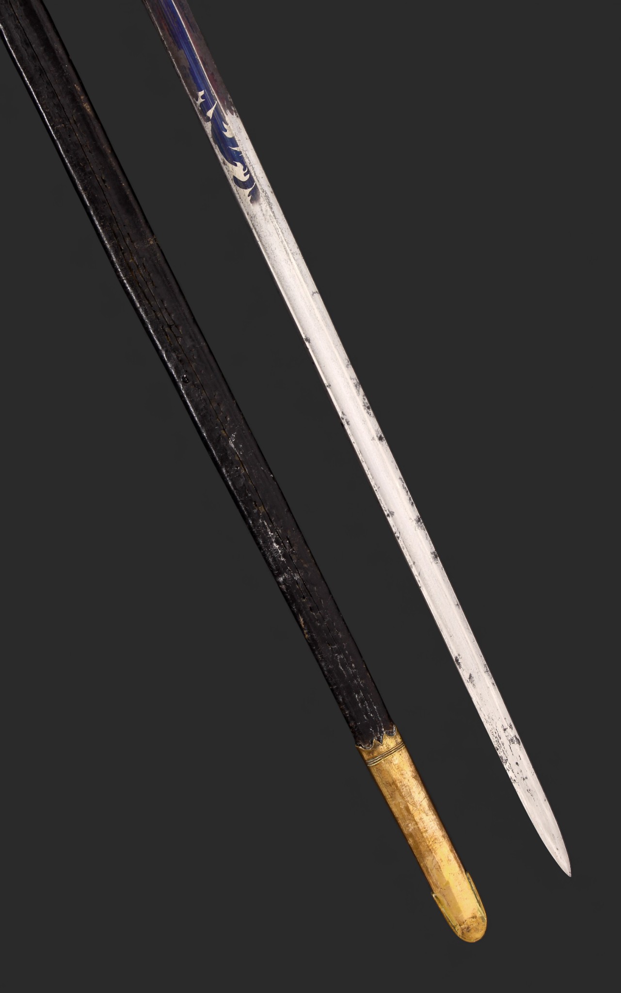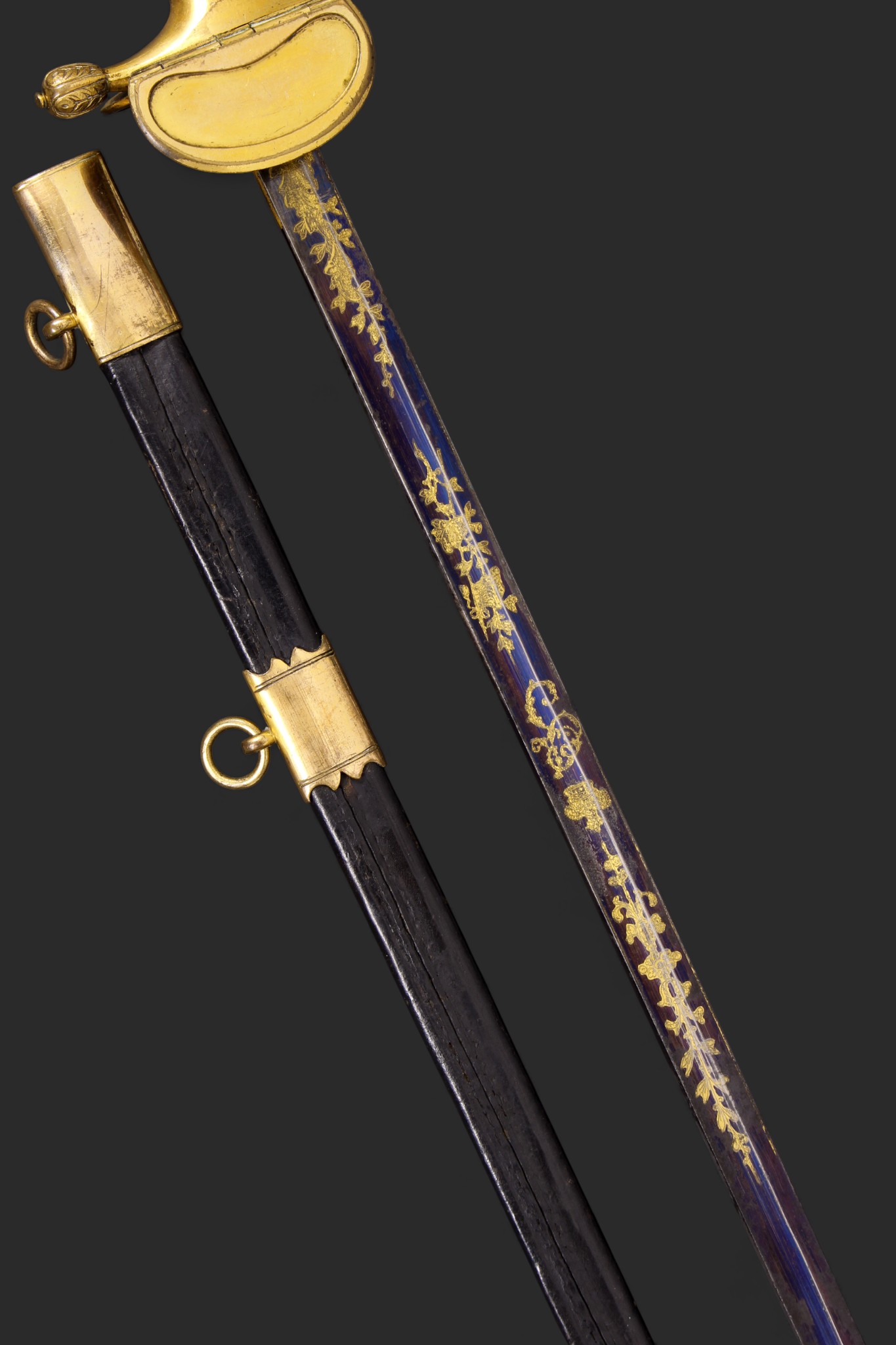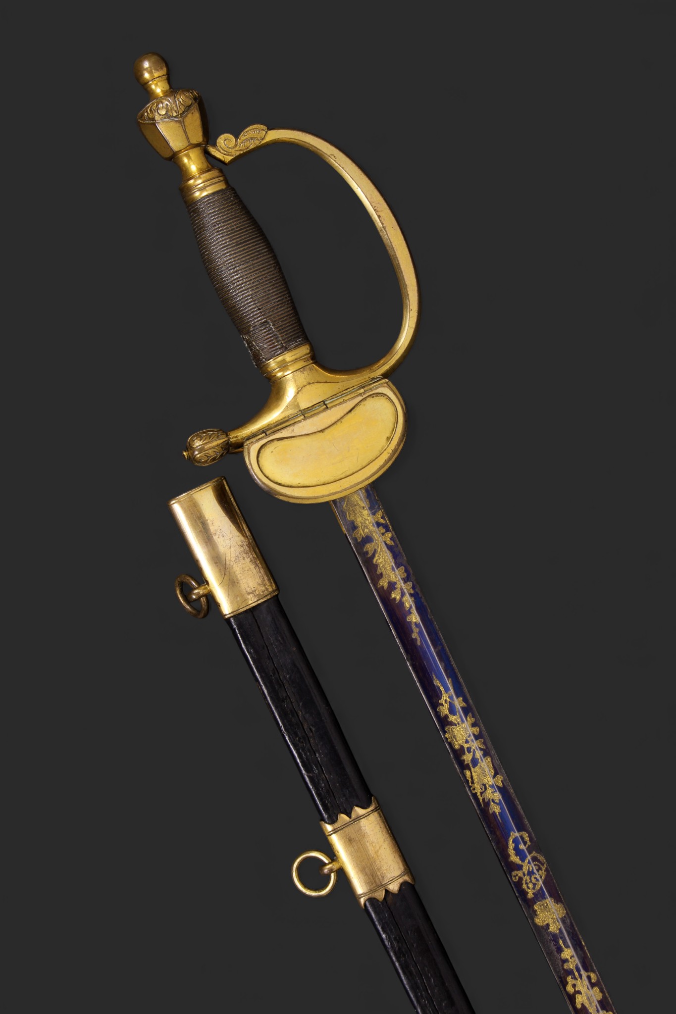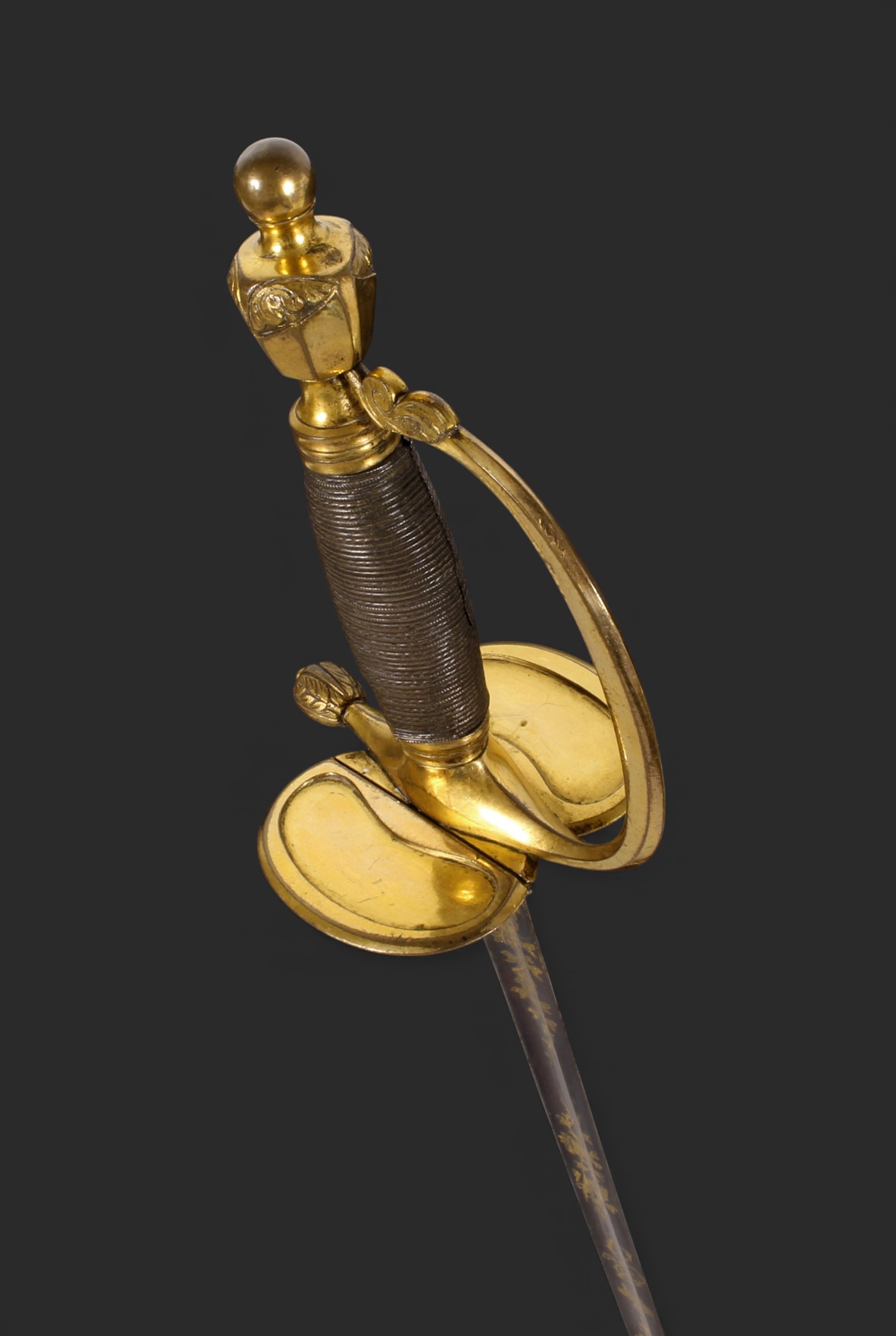 Guarnición en latón sobredorado, con concha posterior abatible. Puño de madera recubierto por una lámina de plata repujada, simulando un torzal. Destaca su notable hoja recta, pavonada en azul y decorada con grabados en oro; entre sus motivos figuran el escudo de Inglaterra y, en el reverso, el monograma de George III (1760–1820). Vaina de cuero con guarniciones en latón sobredorado. Muy buena conservación general, con alguna fisura en la lámina del puño. El pavonado y dorado de la hoja, así como los sobredorados, se encuentran en notable estado. La longitud de la hoja, comparada con la reglamentaria, es ligeramente inferior en esta versión: 29 pulgadas frente a 32, un hecho habitual en las piezas realizadas a medida. Total 89 cm, hoja 73,5 cm.