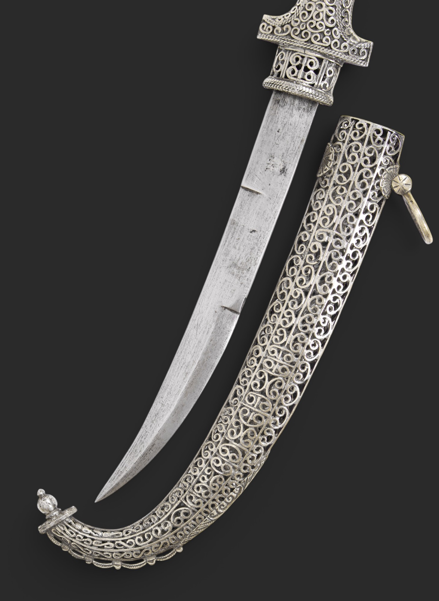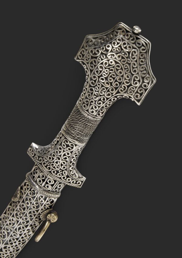 Pieza en plata, destaca por sus decoraciones en relieve, que en el caso de la vaina están enteramente caladas. Muy buena conservación. Rayaduras en la hoja. Falta una anilla de la vaina. Longitud total: 37 cm.