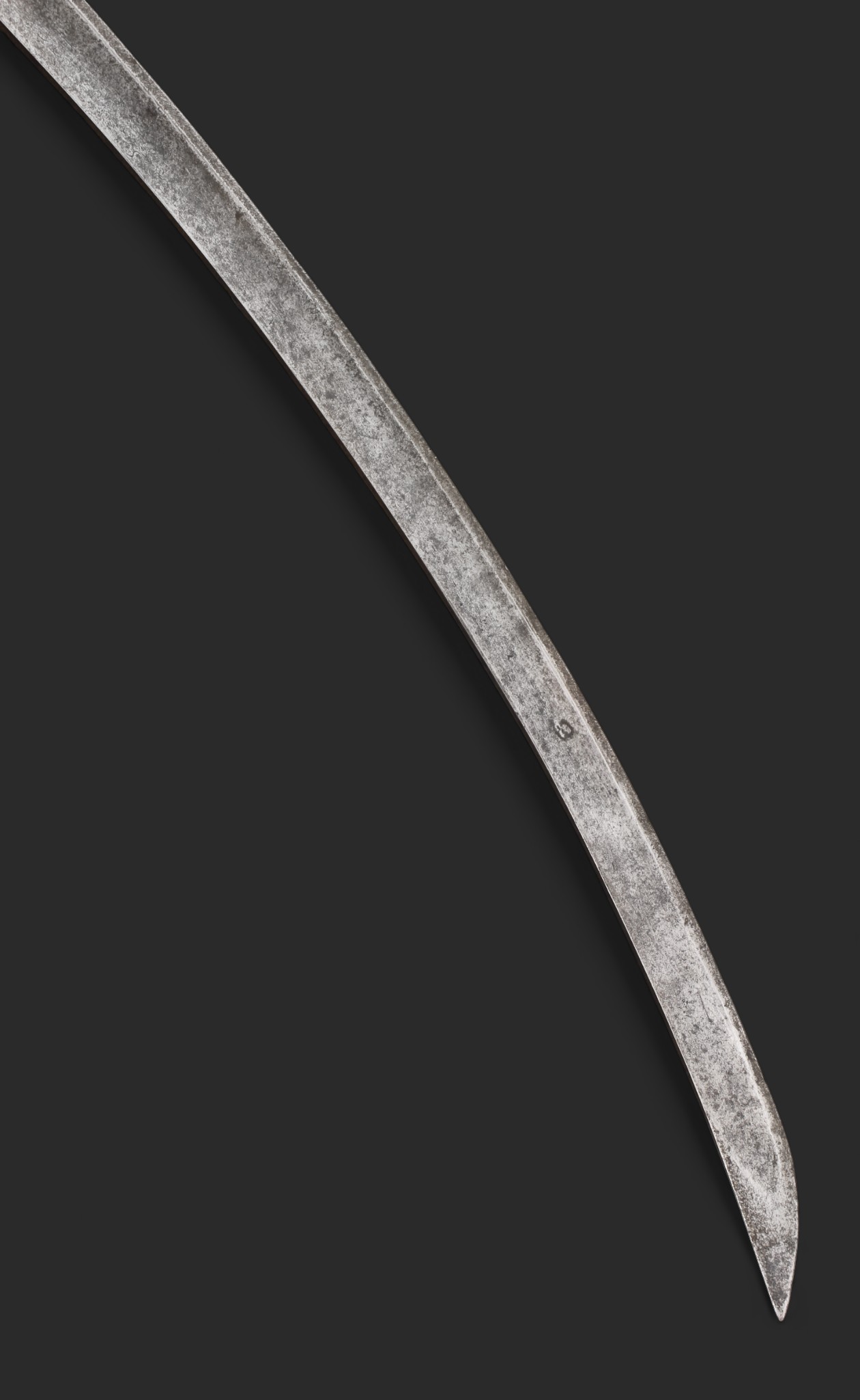 Guarnición de latón de dos gavilanes. Guardamano punzonado “To. LLIURA” y número 4038. Puño de asta gallonado. Hoja curva con restos de decoración y vaceada hasta la pala, esta última acortada respecto a su longitud original. Lomo cuadrado hasta la pala, con inscripción “S & K.”. Longitud total: 85 cm., hoja 73 cm. Buena conservación. Picado regular y manchas.